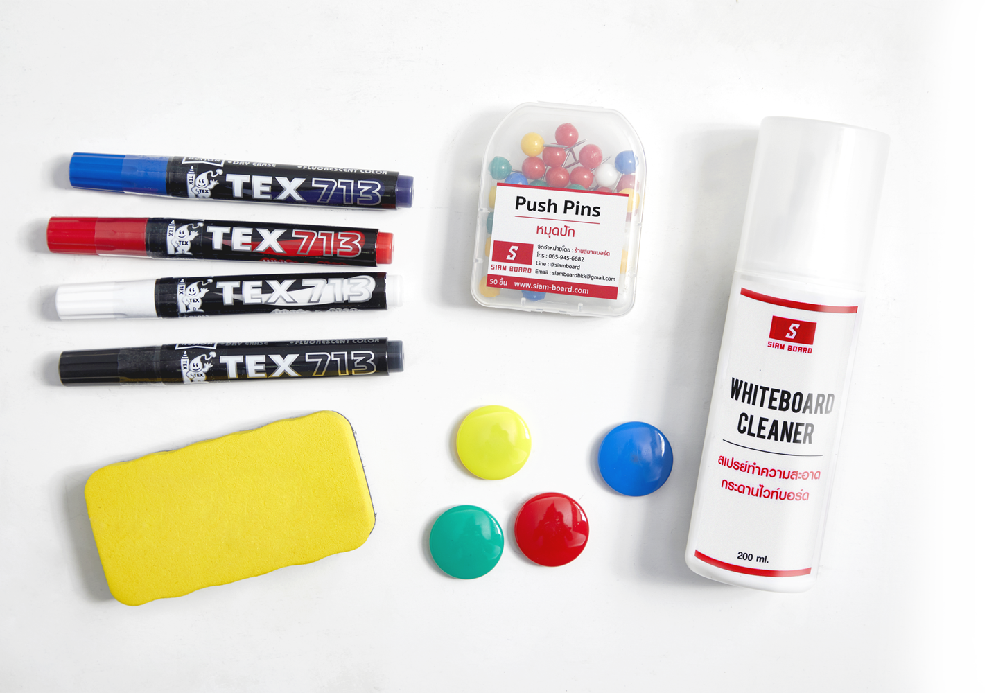 สยามบอร์ดจำหน่ายอุปกรณ์สำหรับใช้งานกับบอร์ดชนิดต่างๆ ไม่ว่าจะเป็นปากกาไวท์บอร์ด ปากกาชอล์คน้ำ หมุดสำหรับปักหมุดติดประกาศ เม็ดแม่เหล็ก แปรงลบกระดาน กล่องใส่ปากกา และอุปกรณ์อื่นๆ